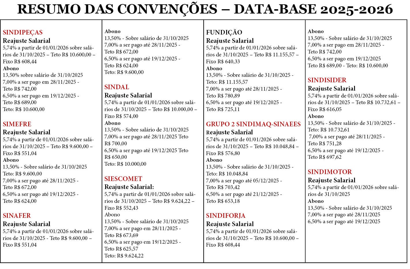 - Reposição da inflação acumulada nos últimos 12 meses, de 4,49%, mais aumento real de 1,20%, totalizando um reajuste de 5,74% a partir de primeiro de janeiro de 2026 sobre os salários de 31 de outubro de 2025.