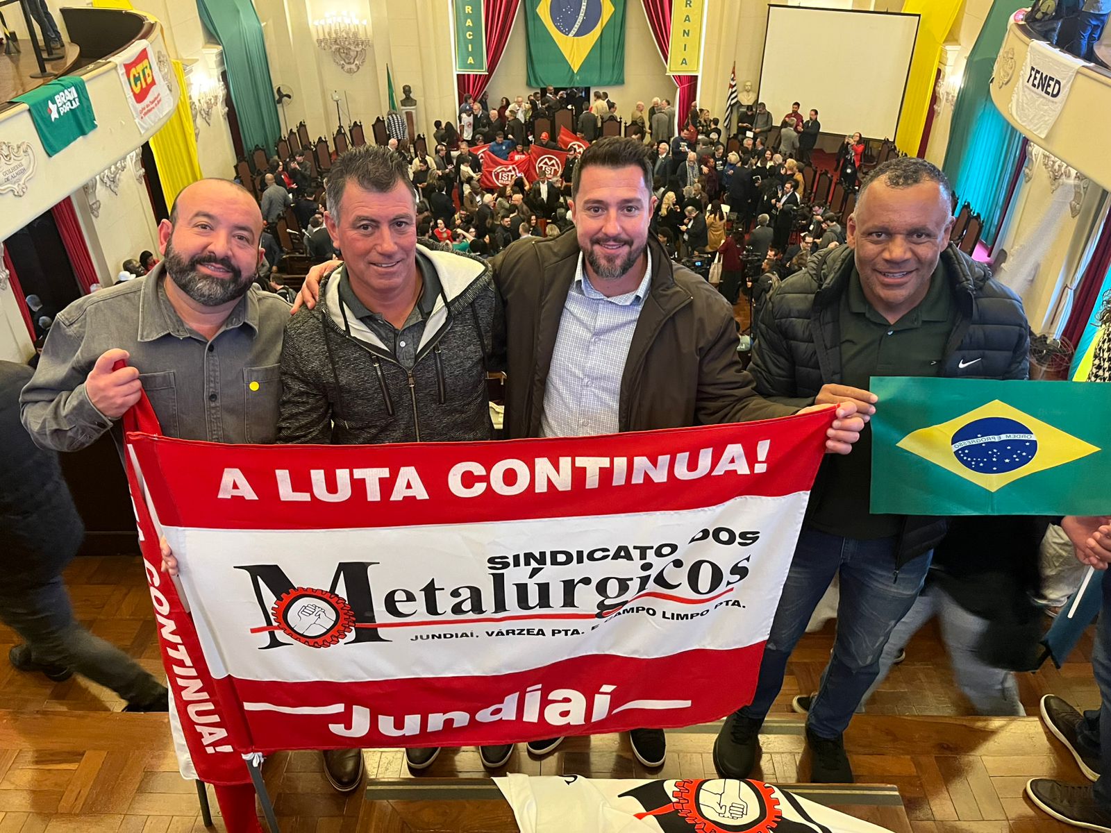 Como sempre presente nas grandes mobilizações, o Sindicato dos Metalúrgicos de Jundiaí e região também esteve no evento, representado pelos diretores Wilson Med, Ricardo Zanini (Sujinho), Marcos Antônio Pereira (Marcão) e Admilson Gomes do Nascimento (Negão). “Defender a soberania não é uma bandeira abstrata. É defender empregos, indústrias, políticas públicas, justiça social e o direito do povo brasileiro de decidir seu destino sem tutelas estrangeiras”, afirmou Med.