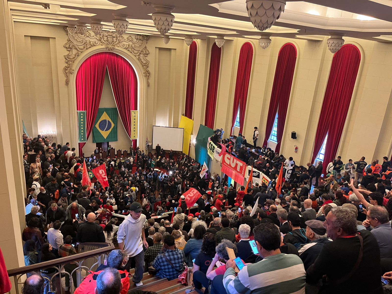 Na manhã desta sexta-feira (25), a centenária Faculdade de Direito da USP voltou a ser palco da resistência democrática e popular. O Salão Nobre foi tomado por juristas, estudantes, parlamentares, sindicalistas, representantes de movimentos sociais e entidades da sociedade civil em um Ato Público em Defesa da Soberania Nacional.